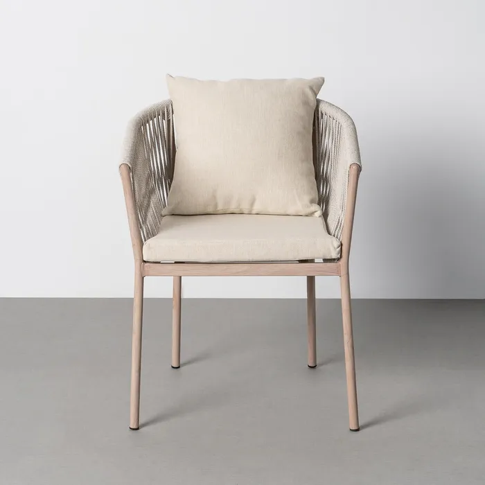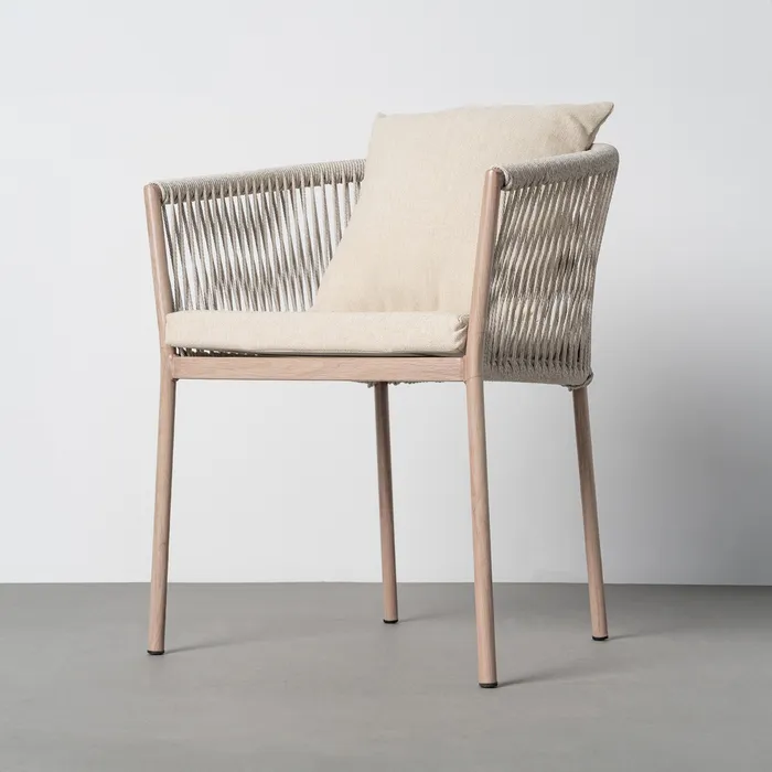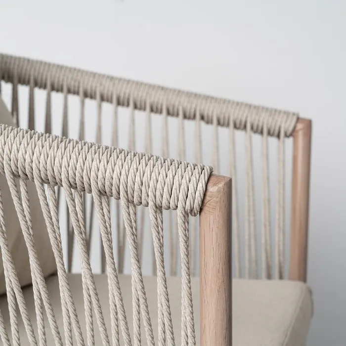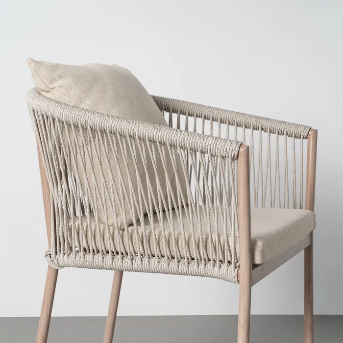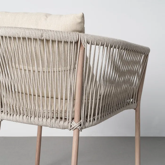 Material: acero, PE ratán. Altura asiento: 47cm. Ancho asiento: 41cm. Profundidad asiento: 34cm. Altura respaldo: 28cm. Altura reposabrazos: 22cm (67cm desde el suelo). Tejido 100% olefina. Relleno de foam y polifibra. Cojines desenfundables. Cumple la normativa EN581 (uso exterior). Los muebles y productos de exterior son aptos para permanecer a la intemperie durante la temporada, sin embargo se recomienda colocarlos bajo techado o protegerlos de la lluvia, ya que el tejido no es a prueba de agua. Una vez acabada la temporada, se recomienda guardar o proteger adecuadamente para asegurar su mantenimiento.