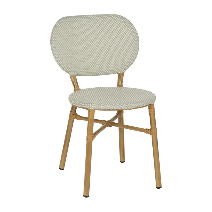 Material: aluminio, textileno. Altura asiento: 46cm. Ancho asiento: 43cm. Profundidad asiento: 43cm. Altura respaldo: 36cm. Apilable.