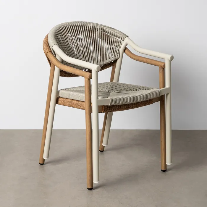 Material: aluminio, PE ratán. Altura asiento: 45cm. Ancho asiento: 40,5cm. Altura respaldo: 39cm. Altura reposabrazos: 19cm (64,5cm desde el suelo). Cumple la normativa EN581 (uso contract).