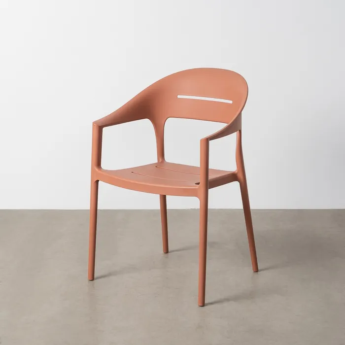 Material: polipropileno. Altura asiento: 45cm. Ancho asiento: 38cm. Profundidad asiento: 42cm. Altura respaldo: 42cm. Altura reposabrazos: 24cm (67cm desde el suelo). Apto para uso exterior. Cumple la normativa EN16139 (catering). Apilable.