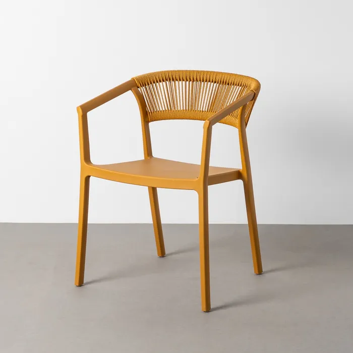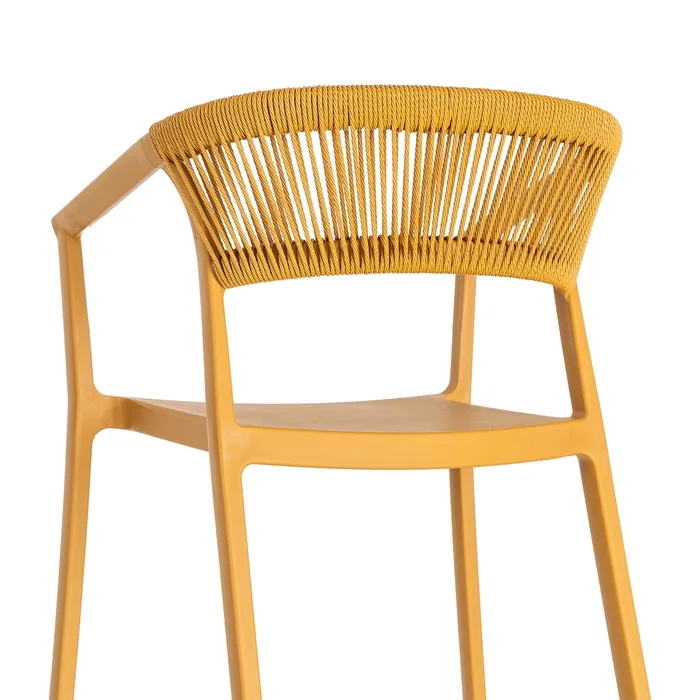 Materiales: Polipropileno, cuerda de polietileno. Altura patas:42cm. Altura respaldo:36cm. Altura del asiento:45,5cm. Medidas del asiento:42,5×40,5cm. Diatancia entre las patas:51cm. Altura del brazo al asiento:22cm (68cm desde el suelo). Peso máximo soportado:150kgs. No requiere montaje. Apilable. Incluye protección anti UV. Cumple con la normativa UNE-EN 16139:2013