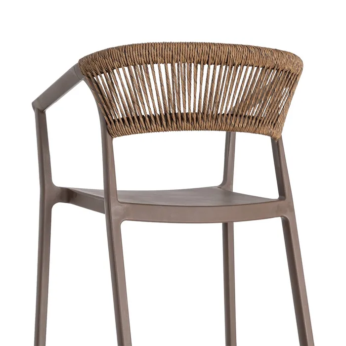 Materiales: Polipropileno, cuerda de polietileno. Altura patas:42cm. Altura respaldo:36cm. Altura del asiento:45,5cm. Medidas del asiento:42,5×40,5cm. Diatancia entre las patas:51cm. Altura del brazo al asiento:22cm (68cm desde el suelo). Peso máximo soportado:150kgs. No requiere montaje. Apilable. Incluye protección anti UV. Cumple con la normativa UNE-EN 16139:2013