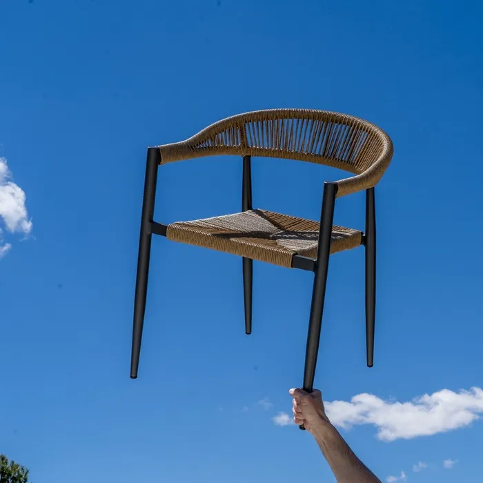Material: polietileno, aluminio. Altura asiento: 45cm. Ancho asiento: 46cm. Profundidad asiento: 43cm. Altura respaldo: 31cm. Apilable. Cumple la normativa EN581 (uso exterior).