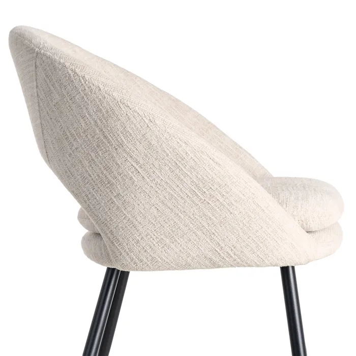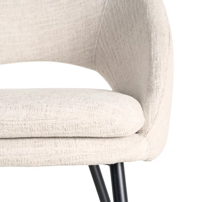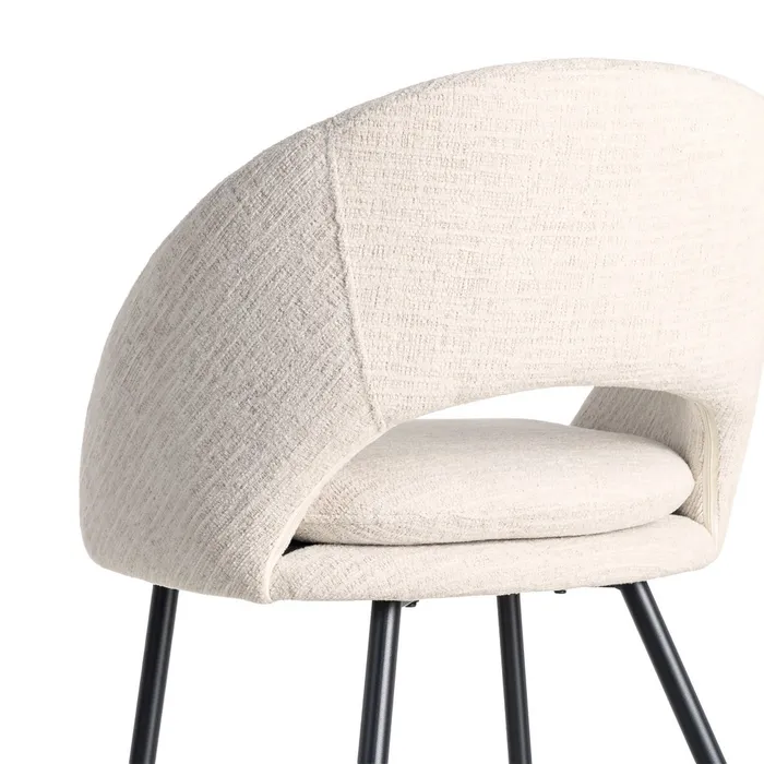 Material: tejido – metal Patas: hierro negro Tejido: 100% poliéster Gramaje: 320gr/m2 Altura asiento: 51.5cm. Altura respaldo: 34cm. Ancho asiento: 46cm. Profundo asiento: 48cm. Patas para montar. Cojín desenfundable con cremallera. Cumple normativa EN16139:2013