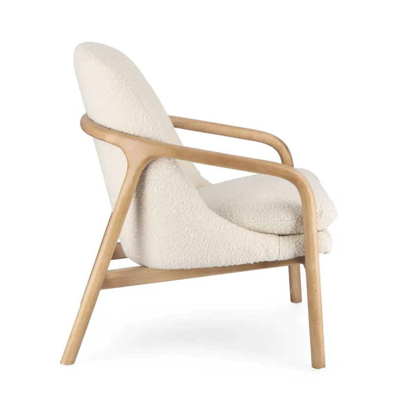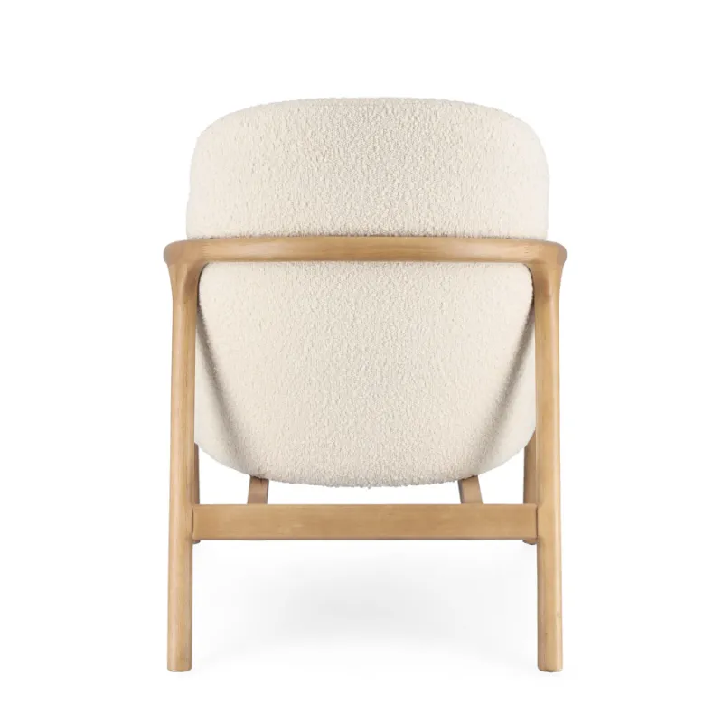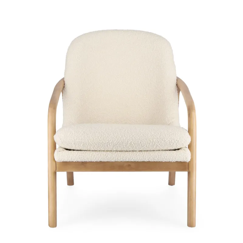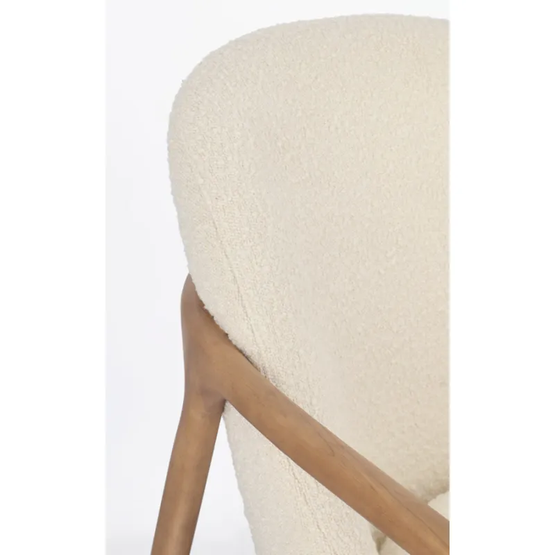 ESTRUCTURA DE RUBBERWOOD. ASIENTO DE MADERA DE PINO Y CONTRACHAPADO. REVESTIMIENTO DE POLIÉSTER EFECTO BOUCLÉ. DENSIDAD RELLENO DE ESPUMA DE POLIURETANO 24KG/M3. COJÍN DEL ASIENTO DESENFUNDABLE.