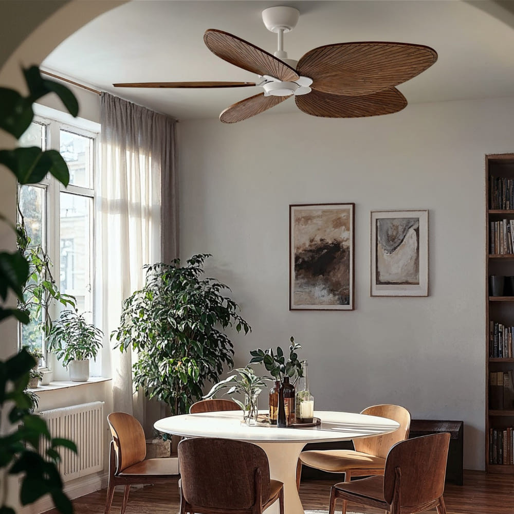 El ventilador de techo ALMA equilibra frescura y diseño, ideal para interiores y exteriores techados (IP44). Con palas de madera de pino FSC en forma de palma y tonos naturales, evoca el estilo relajado de Ibiza. Disponible en dos tamaños (100 cm y 132 cm), opción de 3 o 5 palas y acabados en marrón óxido, latón o blanco, se adapta a cualquier ambiente, desde lo rústico hasta lo moderno. Además, permite elegir entre versiones con luz integrada o sin luz, ofreciendo versatilidad y personalización. ALMA transforma tu hogar en un oasis de frescura, estilo y confort.