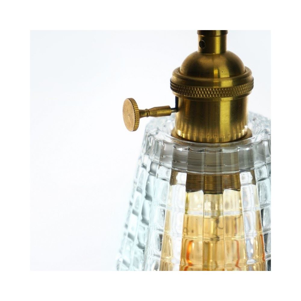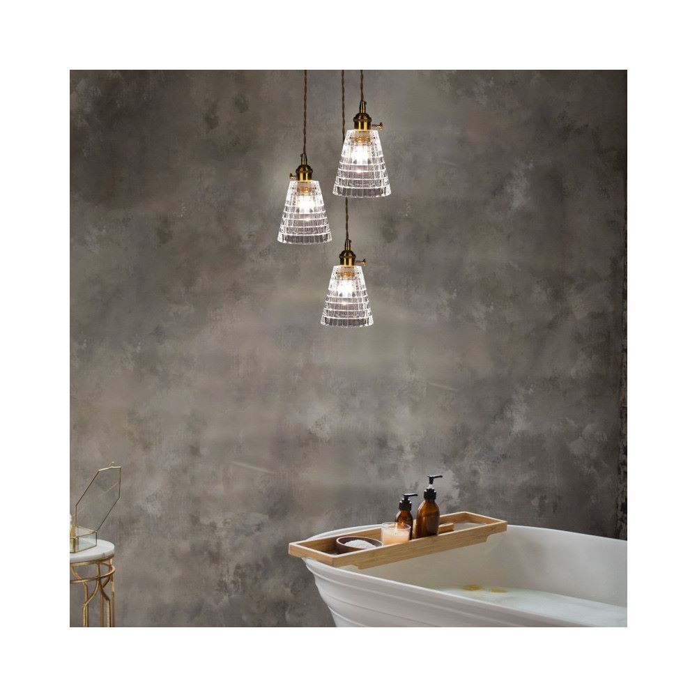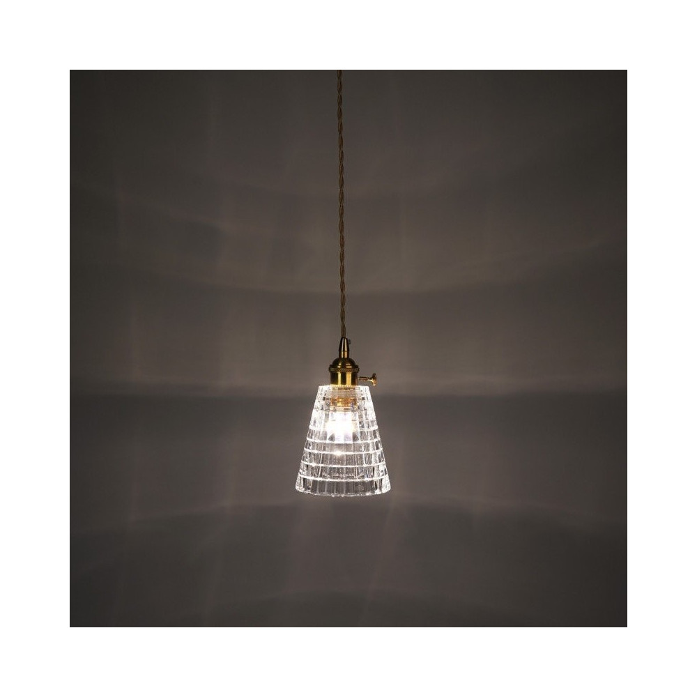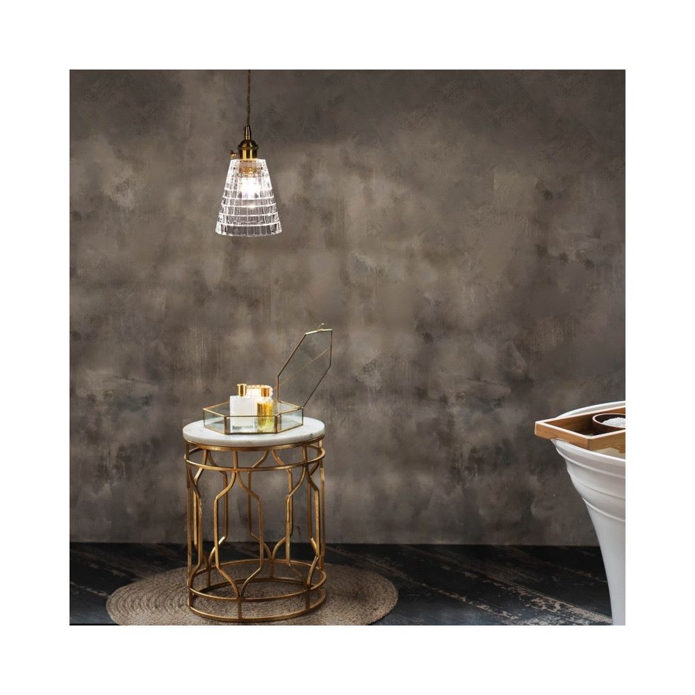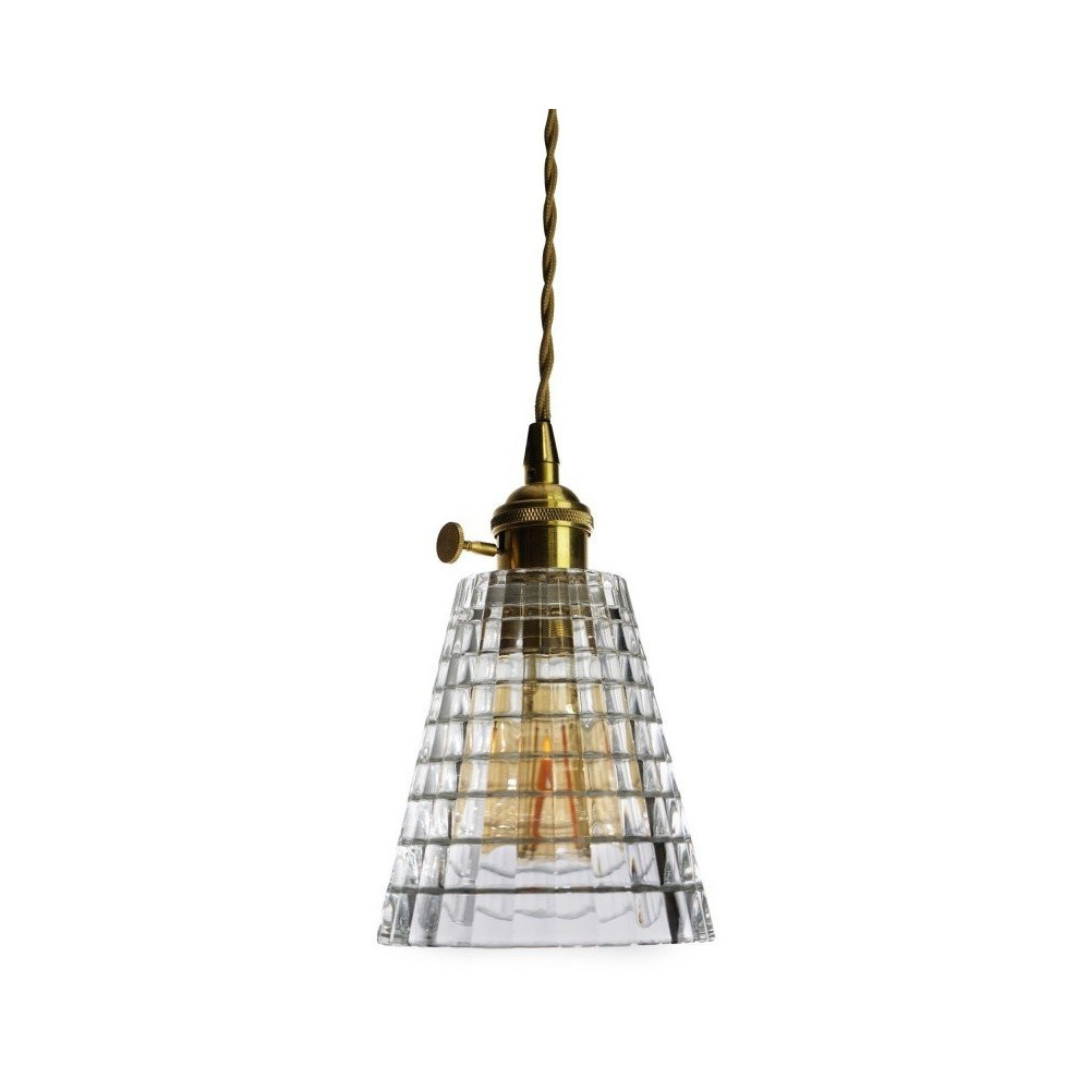 Lámpara de techo con pantalla de vidrio grueso texturizado y portalámparas de metal dorado. La textura del vidrio ayuda a crear un precioso efecto lumínico, y para completar su diseño con aire retro, incluye un interruptor en el portalámparas para apagar y encender la bombilla. Su versatilidad hace que sea la pieza perfecta para iluminar y decorar una zona concreta de nuestro hogar dándole un toque vintage. Forma cónica atemporal, cable trenzado de nailon, casquillo E27 y alltura regulable.