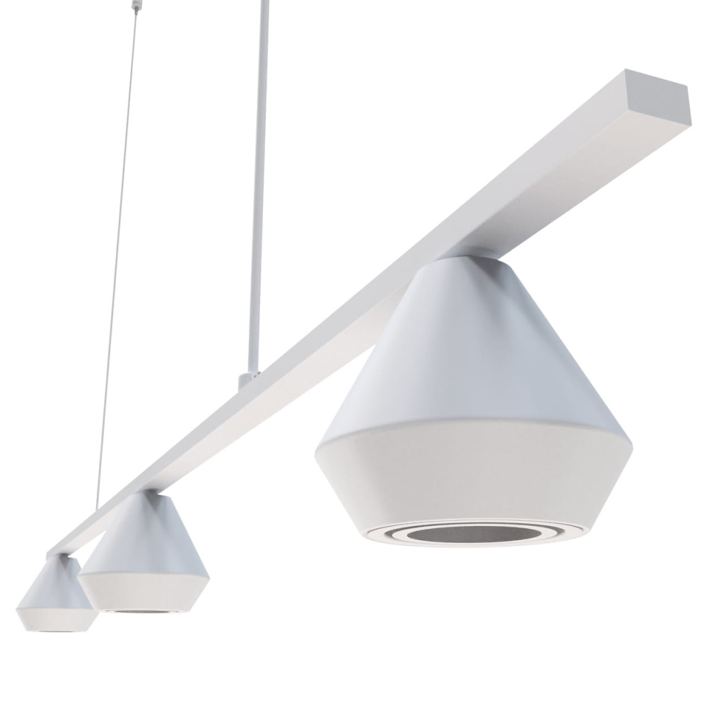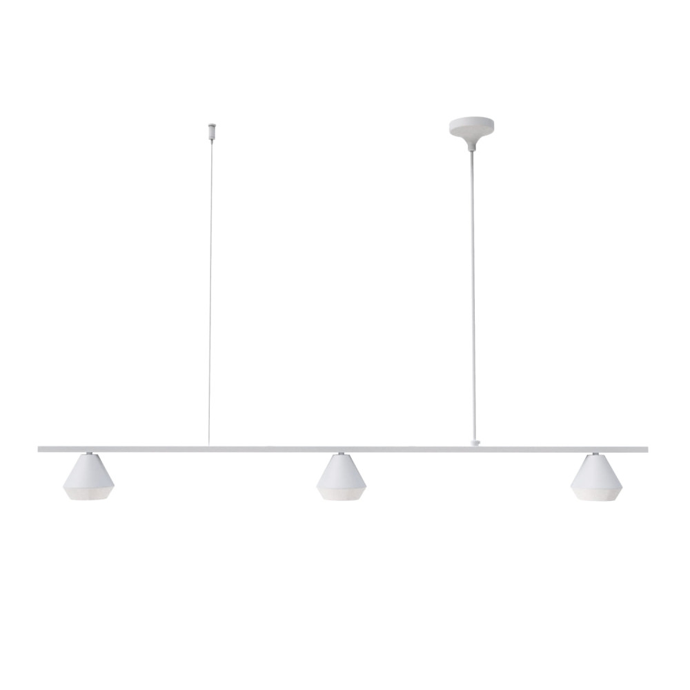 Lámpara de techo lineal con 3 puntos de luz focal en acabado blanco arenado . La versión de LUA más ambiciosa y completa. Esta finísma pieza cuenta con 3 puntos de luz focal dispuestos a lo largo de una barra de metal. Creará un ambiente acogedor y único, ya sea en nuestro negocio o en nuestra cocina o salón. Cuenta con un único florón, lo que le otorga ligereza y elegancia minimalista. Tiene un cable de nailon blanco para un acabado impecable y funciona con 3 bombillas GU10.