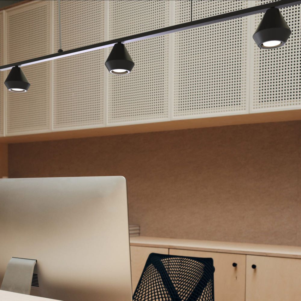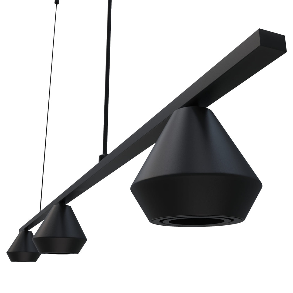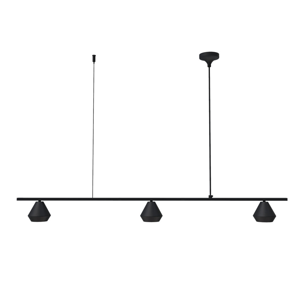 Lámpara de techo lineal con 3 puntos de luz focal en acabado negro arenado. La versión de LUA más ambiciosa y completa. Esta finísma pieza cuenta con 3 puntos de luz focal dispuestos a lo largo de una barra de metal. Creará un ambiente acogedor y único, ya sea en nuestro negocio o en nuestra cocina o salón. Cuenta con un único florón, lo que le otorga ligereza y elegancia minimalista. Tiene un cable de nailon negro para un acabado impecable y funciona con 3 bombillas GU10.