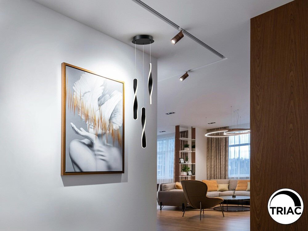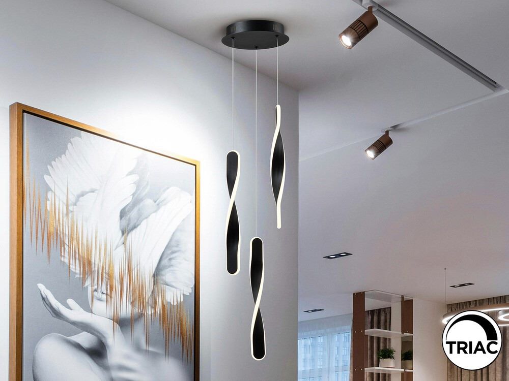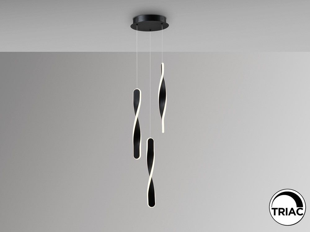 Lámpara de 3 luces Twist en acabado negro mate, fabricada en metal de alta calidad. Equipada con difusores de silicona opal, ofrece una iluminación cálida y uniforme, con una potencia total de 30W, 2100 lúmenes y una temperatura de color de 3000K. Su diseño moderno y minimalista la hace ideal para iluminar salones, comedores o dormitorios.