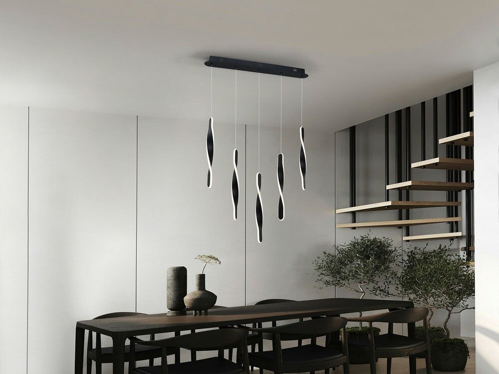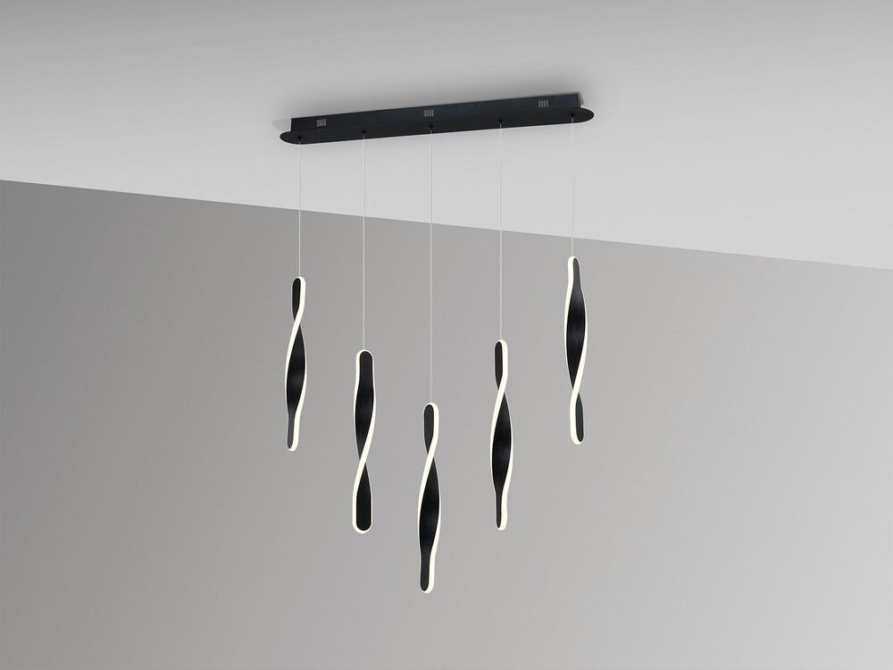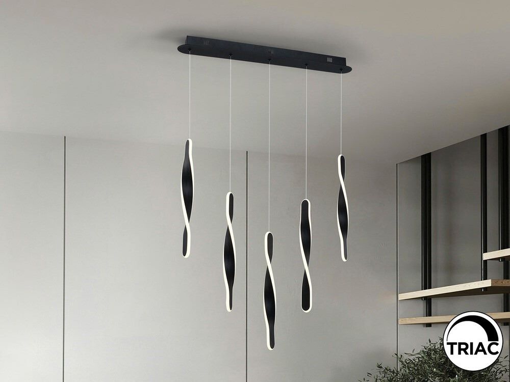 Lámpara de 5 luces Twist en acabado negro mate, fabricada en metal de alta calidad. Equipada con difusores de silicona opal, ofrece una iluminación cálida y uniforme con una potencia total de 50W, 3400 lúmenes y una temperatura de color de 3000K.