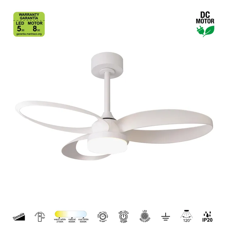 Ventilador de techo con luz, estructura de hierro y ABS y palas de ABS en acabado de color blanco. Dispone de 3 palas, módulo led, motor DC y 6 velocidades. El motor DC (corriente directa), frente a los motores AC (corriente alterna), es más eficiente, reduce el consumo de energía hasta un 70%, proporciona una sensación ultrasilenciosa (disminuye el nivel sonoro hasta en un 50% frente a aparatos con motor AC), evita que el aparato se mueva y tambalee, y crea un buen movimiento de aire con más nivel de velocidad en la ventilación. Además, son motores pequeños y duraderos.