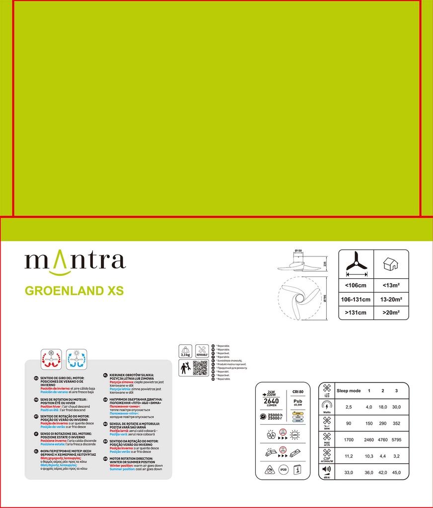 Ventilador de techo GROENLAND de 79,5cm de diámetro y una altura de 21,5cm. Acabado en blanco. Luz LED de 24W, temperatura regulable (2700-5000k) e intensidad regulable de 2640lm (360º). Motor silencioso DC de 30W con 3 velocidades. Función invierno/verano y modo noche. Control remoto a través de mando a distancia incluido por radiofrecuencia. Uso recomendado en interior (índice de protección: IP20). 5 años de garantía.