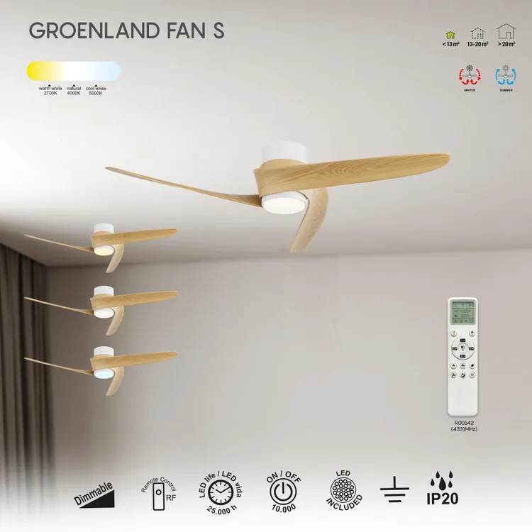 Ventilador de techo GROENLAND de 102cm de diámetro y una altura de 21,5cm. Acabado en blanco e imitación madera. Luz LED de 24W, temperatura regulable (2700-5000k) e intensidad regulable de 2640lm (360º). Motor silencioso DC de 30W con 8 velocidades. Función invierno/verano, función brisa y modo noche. Control remoto a través de aplicación y mando a distancia incluido por radiofrecuencia. Uso recomendado en interior (índice de protección: IP20). 5 años de garantía.