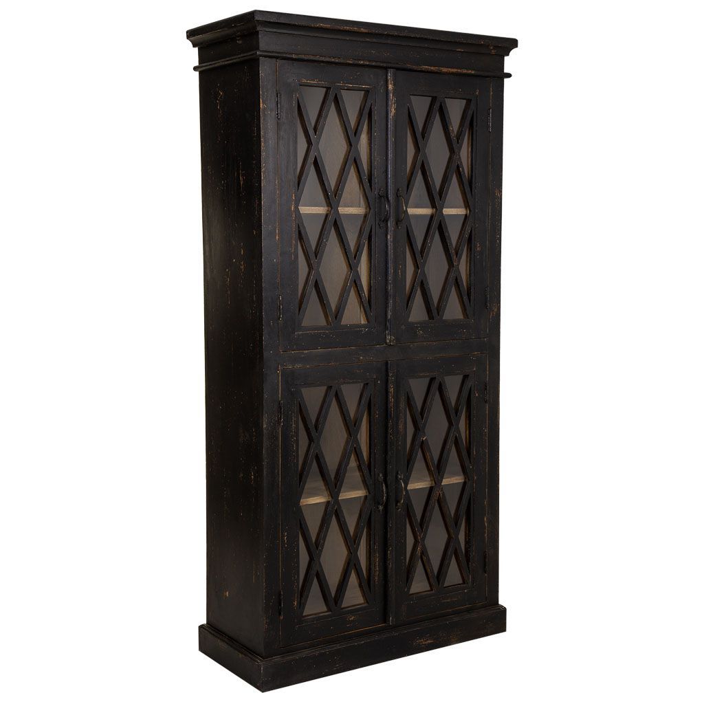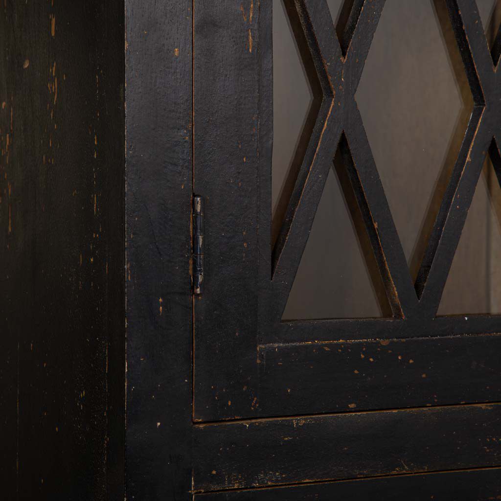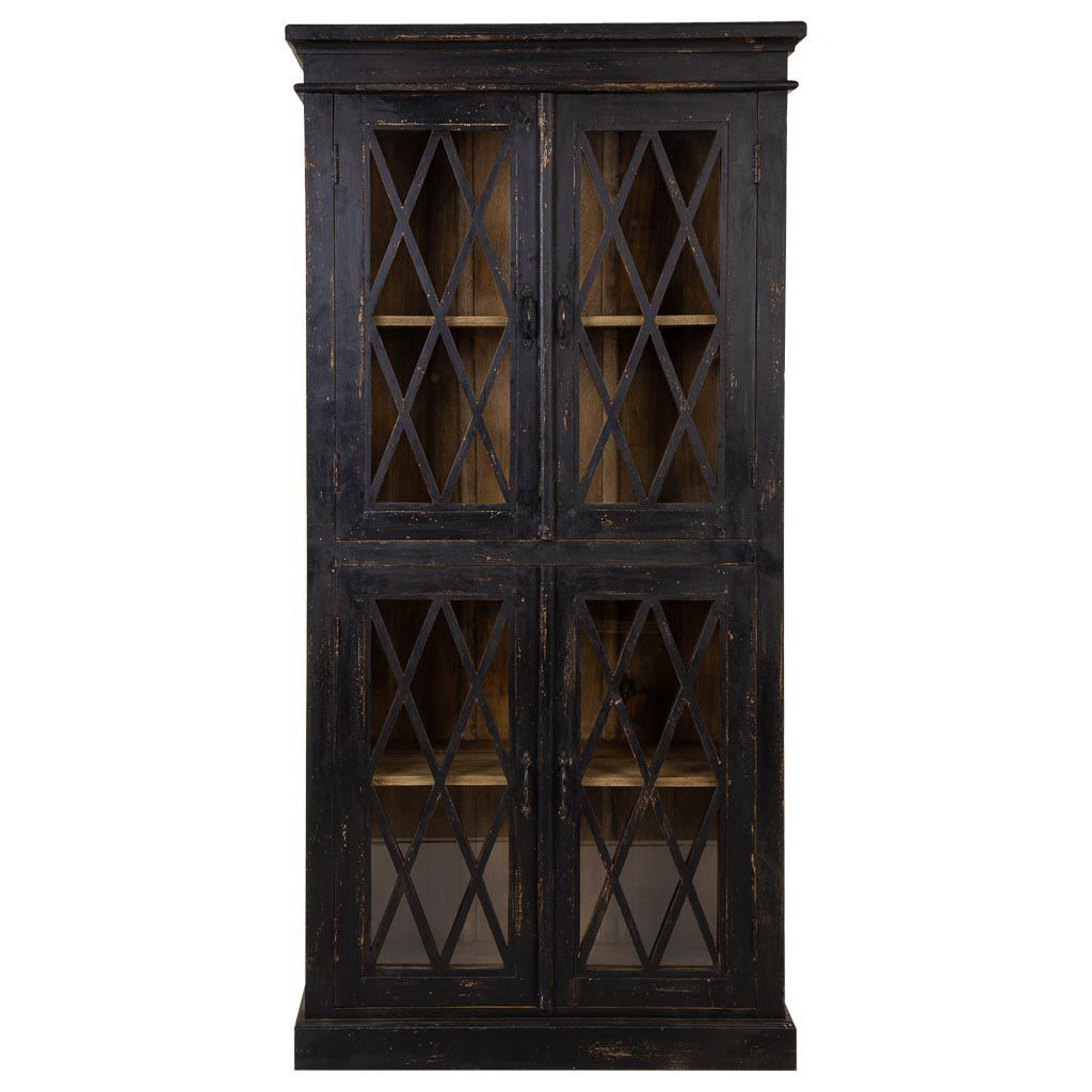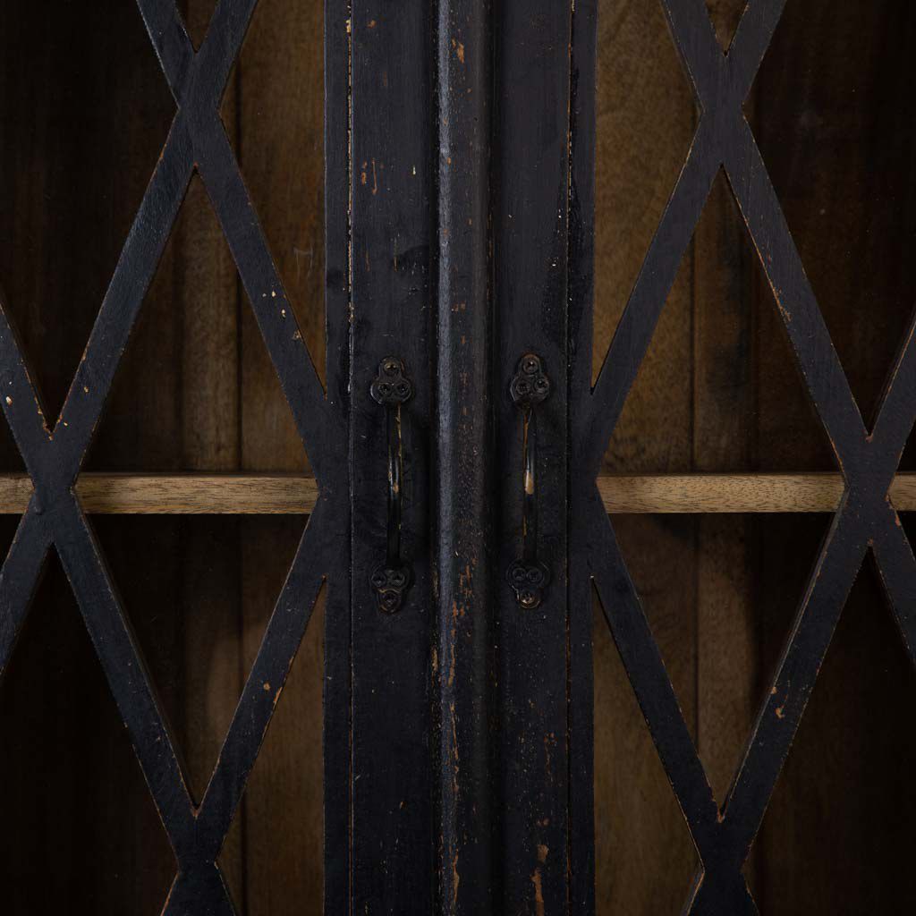 Vitrina de madera y cristal de acabado artesanal negra 90x40x183h cm. Tiene doble altura con un espacio para almacenaje de 38cm en cada una de las partes. Dispone de 4 puertas con cristal lo que hace que el almacenaje resulte comodo y sencillo.