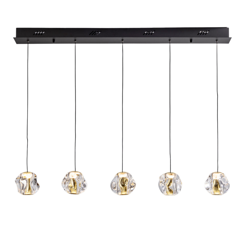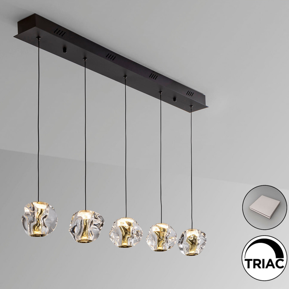 La lámpara de 5 luces Zaria combina elegancia y funcionalidad en un diseño único. Fabricada en metal con un acabado negro mate y detalles dorados, cuenta con tulipas de acrílico transparente que añaden un toque sofisticado a cualquier espacio. Con tecnología LED de 21W, proporciona una iluminación de 1339 lúmenes y una temperatura de color cálida de 3000K, ideal para crear ambientes agradables.